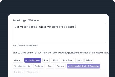 Nach Eingabe Ihrer Eventdaten wählen Sie Ihre Wunsch-Gerichte, Getränke und Zubehör aus.